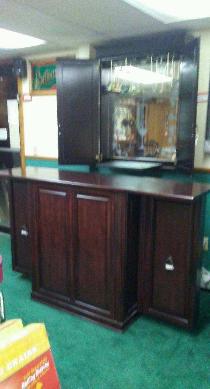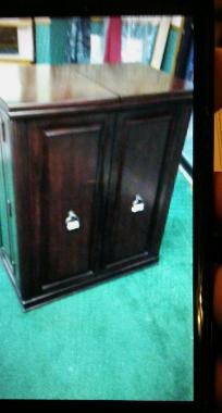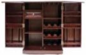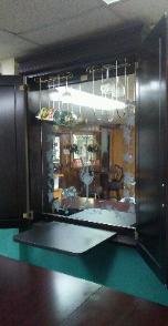 | Double Bars Wall bar and folding bar NEW 2 bars - a wall bar with bottle and glass holders. Etched mirror of wine being poured. The floor bar is a folding bar. Also has wheels so can be moved easy. Mahogany finish Now $2999.00 + shipping |